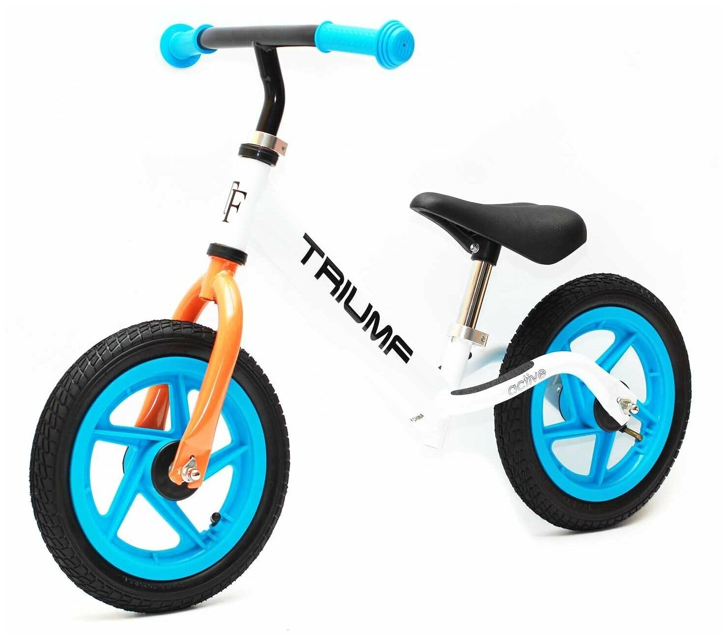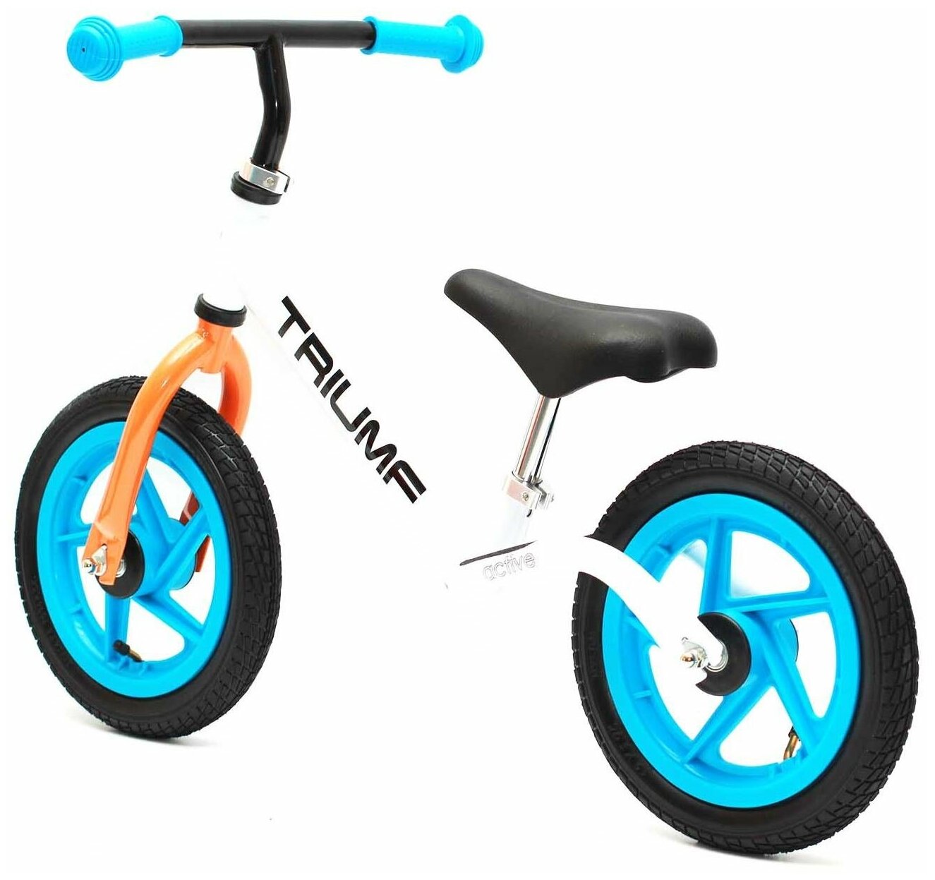 Лучшие цены. Triumf Active Беговел AKB-1209W. Беговелы – это детские двухколесные велосипеды, у которых нет педалей. Они совмещают в себе черты велосипеда и самоката и помогают держать равновесие. Лучший способ разнообразить летнюю прогулку с ребенком. Максимальный вес наездника 35 кг. Размеры: 87х41х65 см Регулируемая высота руля от 55 до 65 см от пола Регулировка сиденья: от 30 до 45 см от пола Надувные резиновые колеса 12 дюймов. Прорезиненные ручки. Магазины в вашем городе.