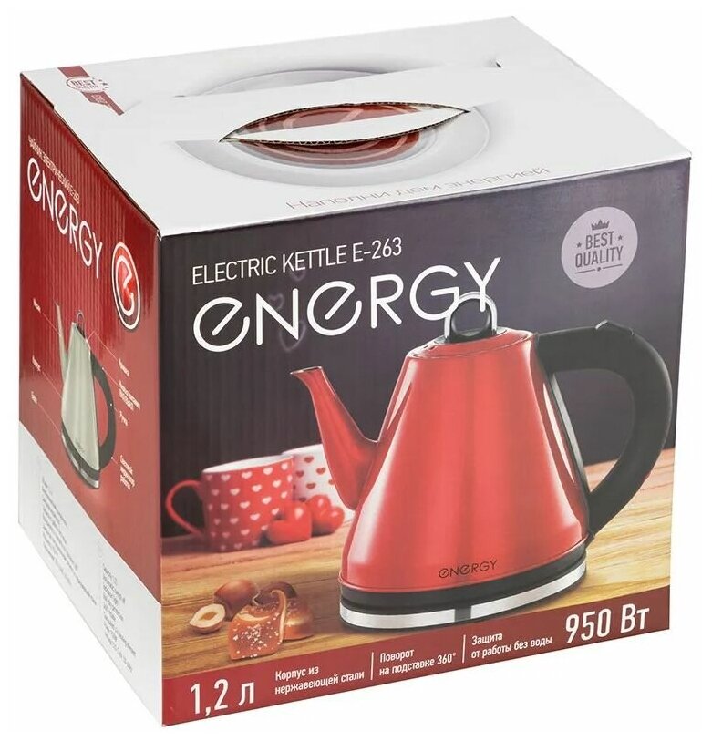 Чайник электрический Energy, E-263, черный, 1.2 л, 950 Вт, скрытый нагревательный элемент, нержавеющая сталь