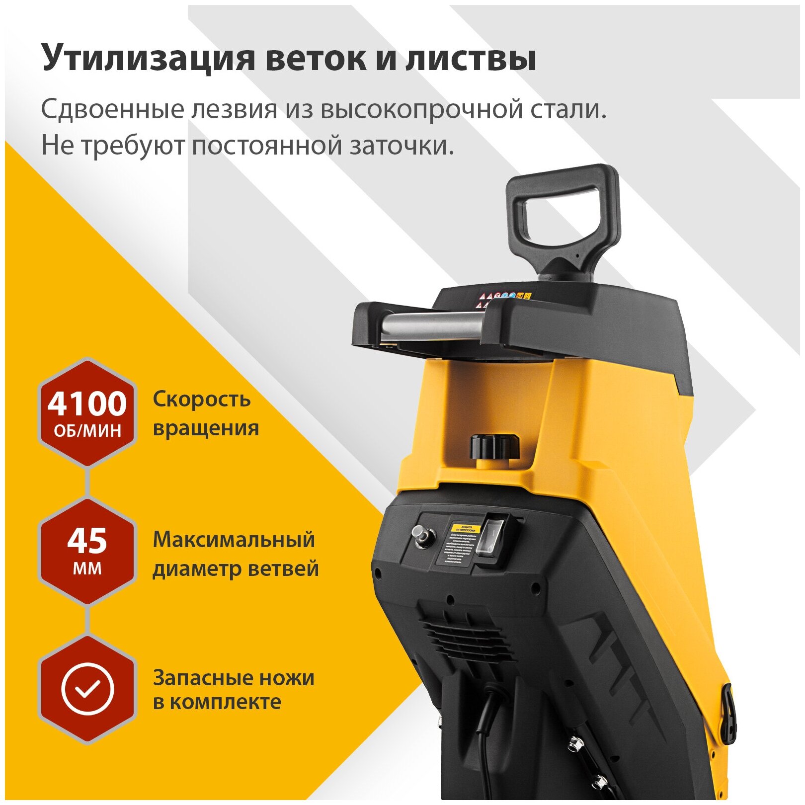 Лучшие цены. Измельчитель садовый электрический Denzel ECS-2500 59701 мощностью 2500 Вт предназначен для утилизации веток, листвы, скошенной растительности диаметром до 45 мм. Станет незаменимым помощником в саду или на даче, позволит поддерживать порядок на приусадебном участке. Скорость вращения режущих элементов составляет 4100 оборотов в минуту, что позволяет быстро решать поставленные задачи. Преимущества Надежность — мотор измельчителя с медной обмоткой защищен от перегрева и перегрузок. Магазины в вашем городе.