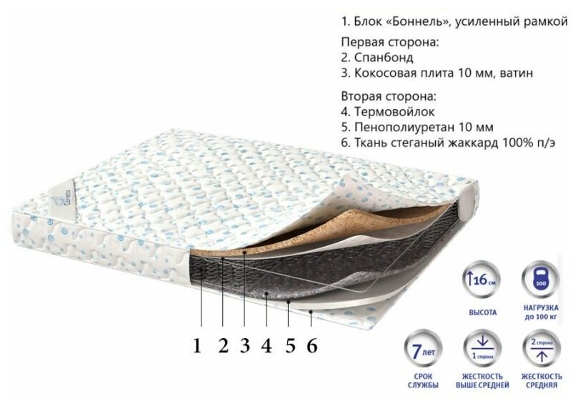 Лучшие цены. Матрас Business 2, основывается на классическом блоке пружин Bonnel, выдерживает большие нагрузки и долго служит. Пружины собраны в единую сеть, не провисают и не скрипят. В матрасе с разных сторон расположены различные наполнители и материалы изоляционных слоев. Одна сторона составлена из спанбонда и койры кокоса, вторая состоит из войлока и эластичного пенополиуретана. Наполнители устойчивы к износу и нагрузкам, образуют разную жесткость сторон, не вызывают аллергию, гигиеничны и безопасны. Магазины в вашем городе.