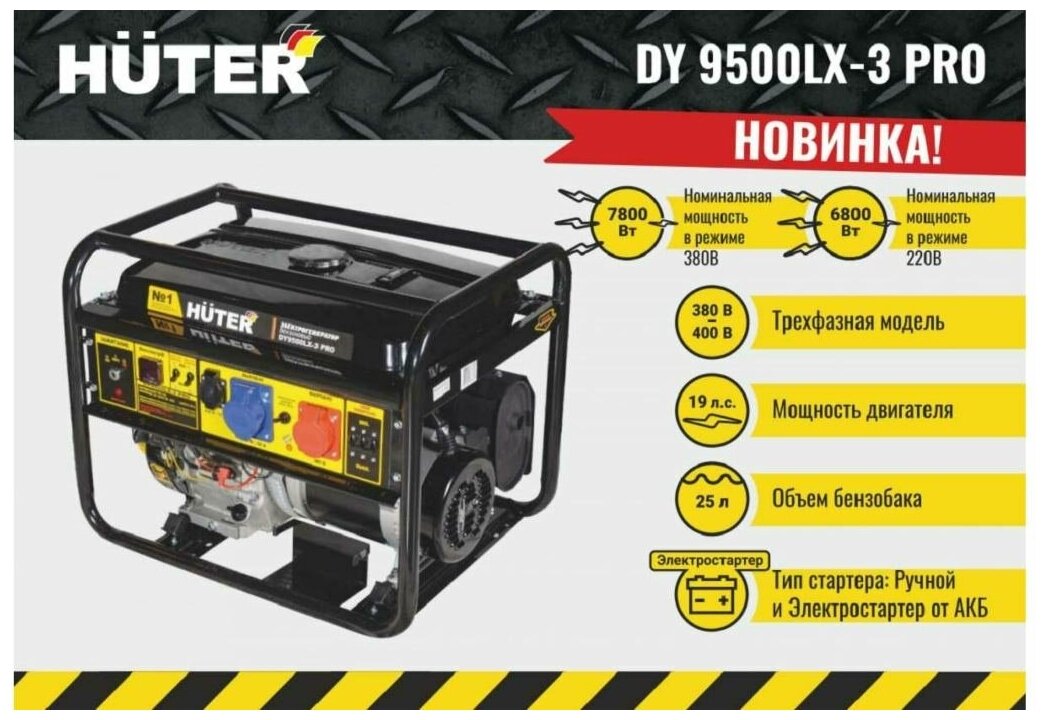 "Генератор бензиновый Huter DY9500LX-3 Pro, (8500 Вт) для дома/огорода/дачи/стройки"