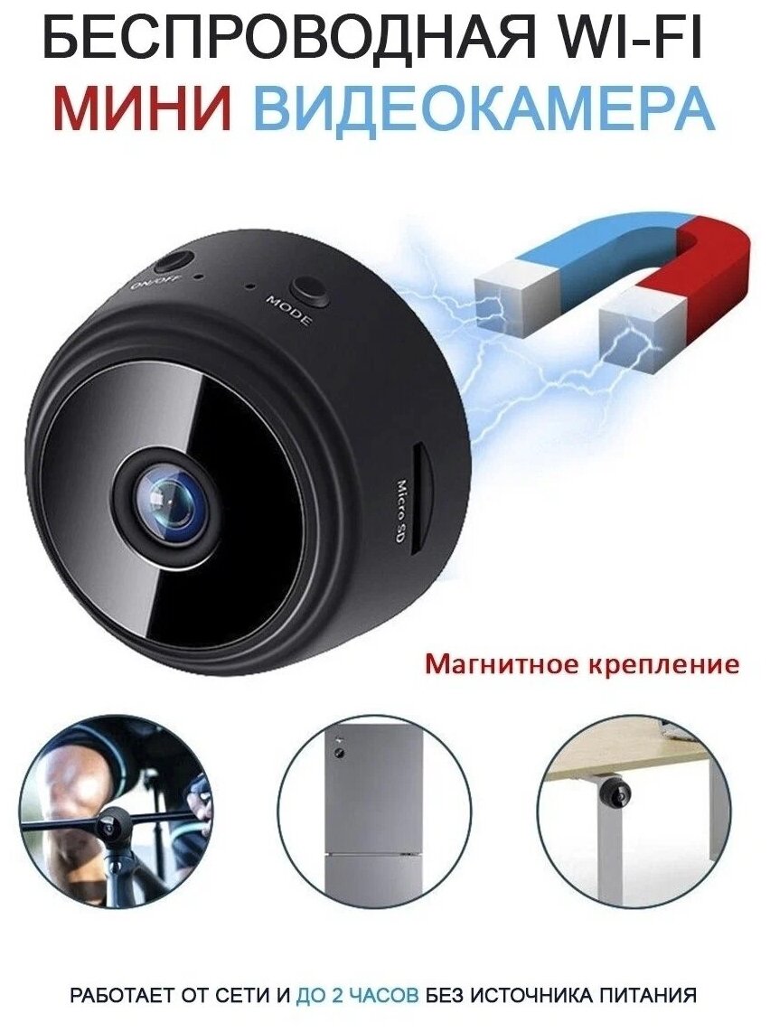 Лучшие цены. Беспроводная мини-камера с удобным магнитным креплением. Благодаря встроенной литиевой батарее, камера может работать еще 2 часа без сетевой зарядки. Также она имеет высокое разрешение изображения, инфракрасное ночное видение и датчик движения. Подключается камера по домашней сети WIFI в пределах зоны действия вашего роутера или через IP соединение. Просмотр, настройка и управление камерой осуществляется через мобильное приложение. Магазины в вашем городе.