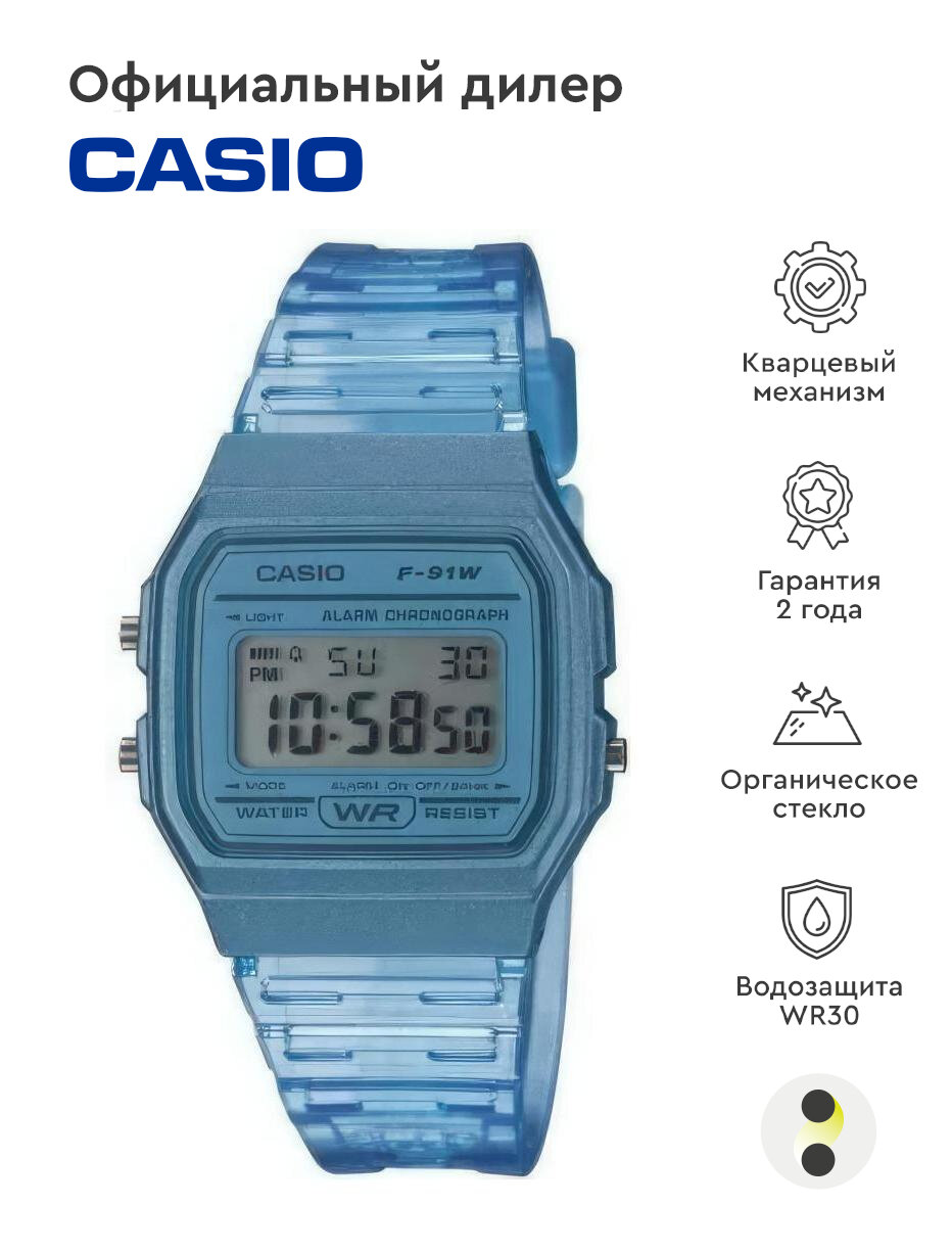 Наручные часы CASIO Collection F-91WS-2EF кварцевые, будильник, хронограф, секундомер, водонепроницаемые, подсветка дисплея, голубой