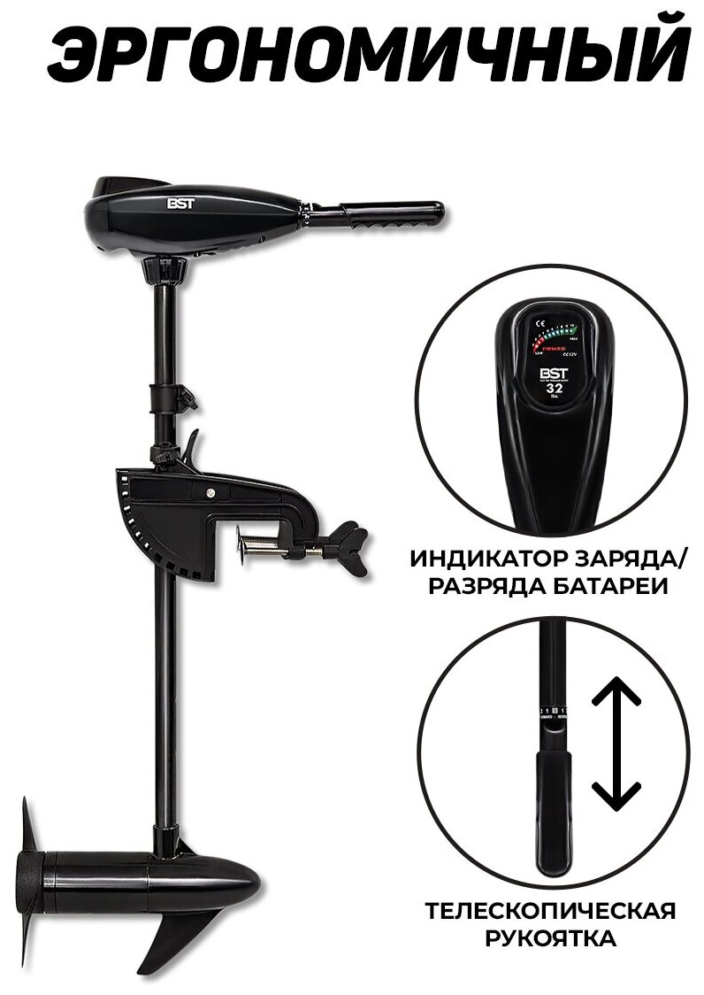 Лучшие цены. Знакомьтесь, это лодочный электромотор BST 32 L Ваш лучший друг на рыбалке и отдыхе на воде. Экологичный, эргономичный, бесшумный! BST - от слова Best - лучший! Давайте выясним, почему же он лучший: индикатор заряда/разряда батареи (10 делений) телескопическая ручка телескопическое крепление к транцу качественная сборка Характеристики: мощность - 32lbs максимальная масса лодки - 650кг тяговое усилие - 14,5кг максимальный ток - 26А индикатор разряда - да (светодиодный). Магазины в вашем городе.