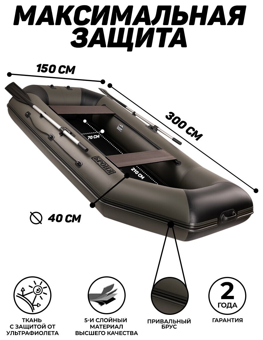 Надувная лодка пвх Броня-300М с усилением зеленый-черный