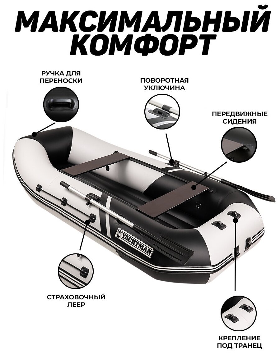 Надувная лодка ПВХ YACHTMAN-280 МНД надувное ДНО с усилением серо-чёрная
