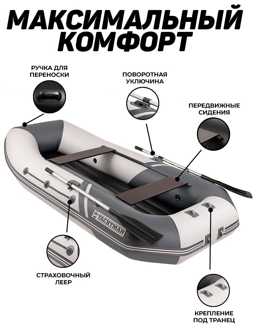 Надувная лодка ПВХ YACHTMAN-280 МНД надувное ДНО с усилением серо-чёрная