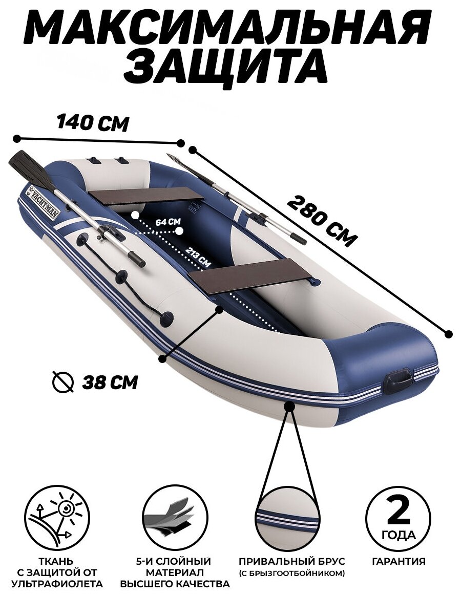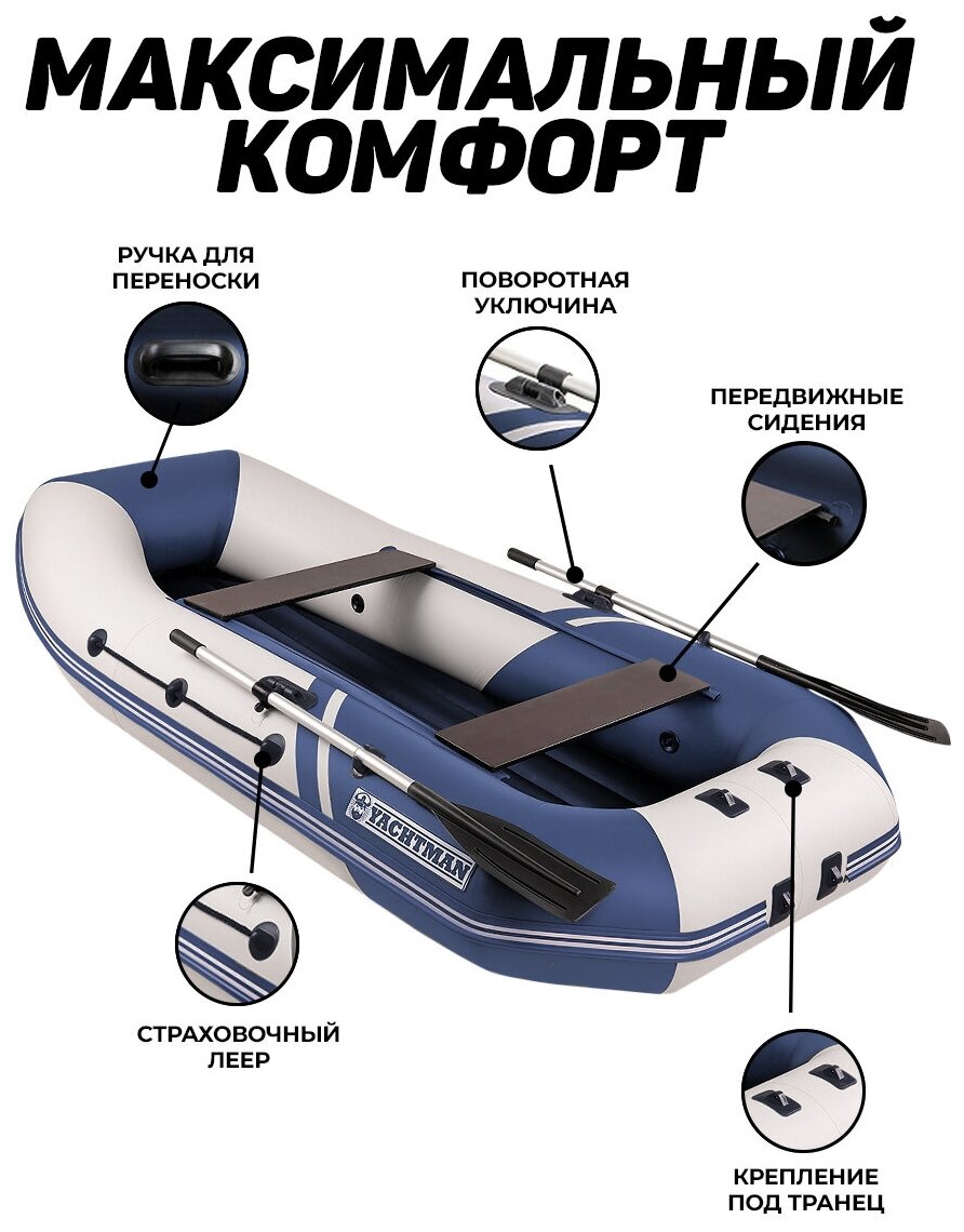 Лодка ПВХ YACHTMAN 280 МНД, надувное дно, 2х-местная для рыбалки, для охоты, для отдыха, надувная