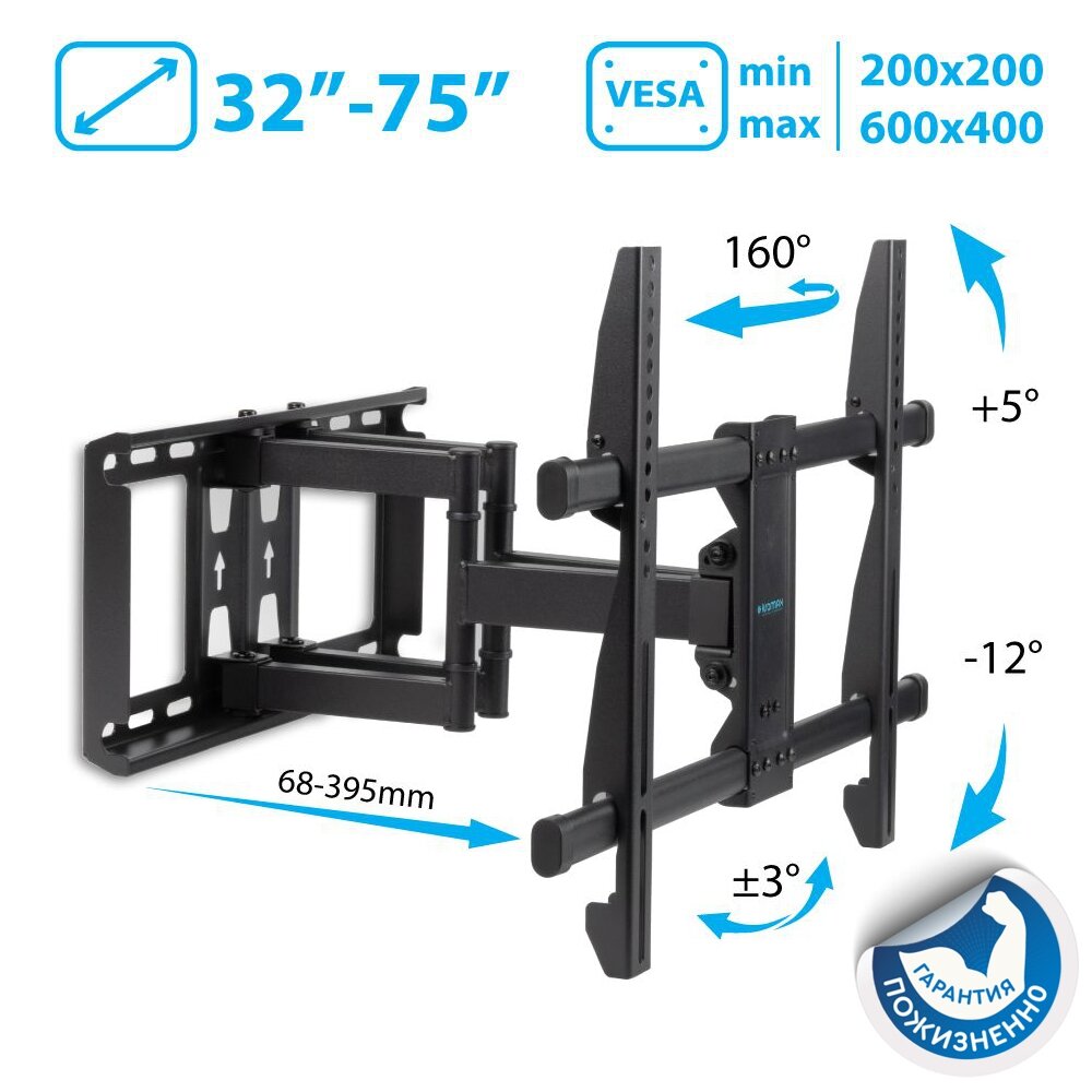 Кронштейн для телевизора настенный Kromax GALACTIC-57 / до 75 дюймов / до 60 кг / vesa 600x400 / наклонно-поворотное крепление для тв / держатель для телевизора