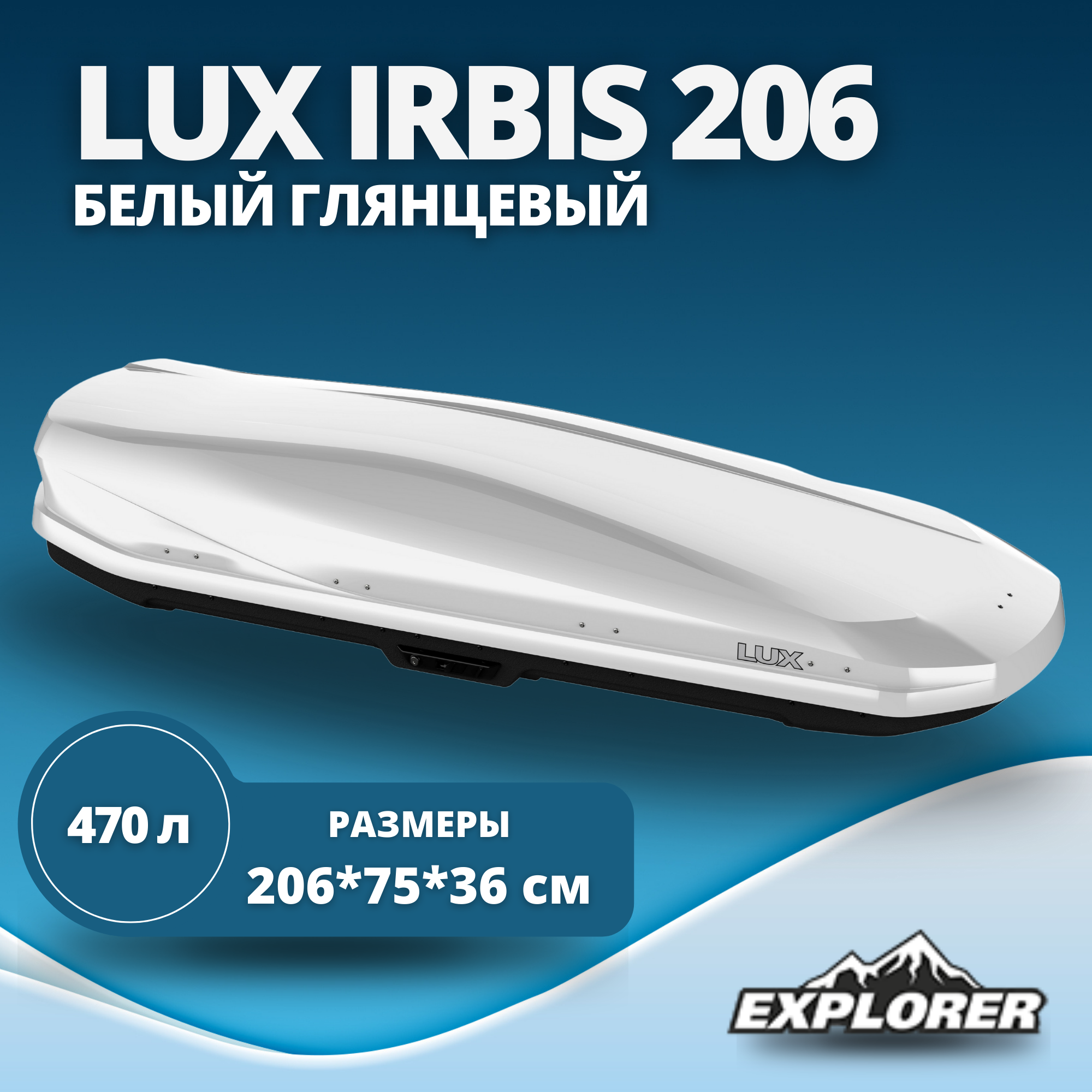Багажники (аэробоксы) Бокс на крышу LUX IRBIS 206, 470л, белый глянцевый , 206х75х36, с двухсторонним открыванием, арт:LUX-794201