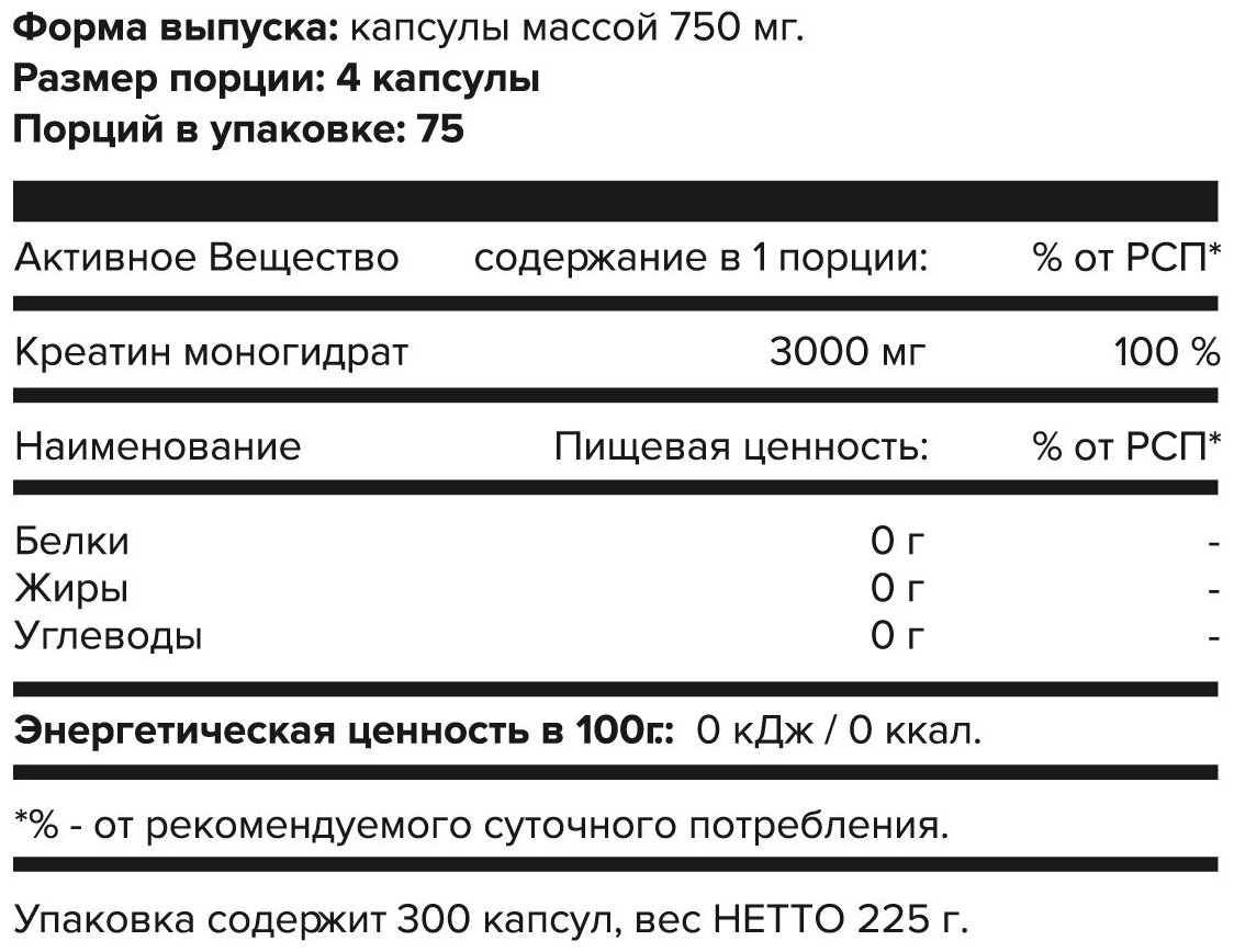 Лучшие цены. " креатин моногидрат 100%" / " CREATINE MONOHYDRATE 100%" - уникальный комплекс на основе креатина, содержащий чистый моногидрат креатина высочайшего качества с транспортной системой. . Креатин в этой форме эффективно усваивается и достигает мышц в неизменном виде. Он увеличивает мышечную массу, влияет на значительное увеличение силы и выносливости и способствует усвоению организмом питательных веществ. Пищевая ценность в 4 капсулах : креатин моногидрат – 3000мг. Магазины в вашем городе.