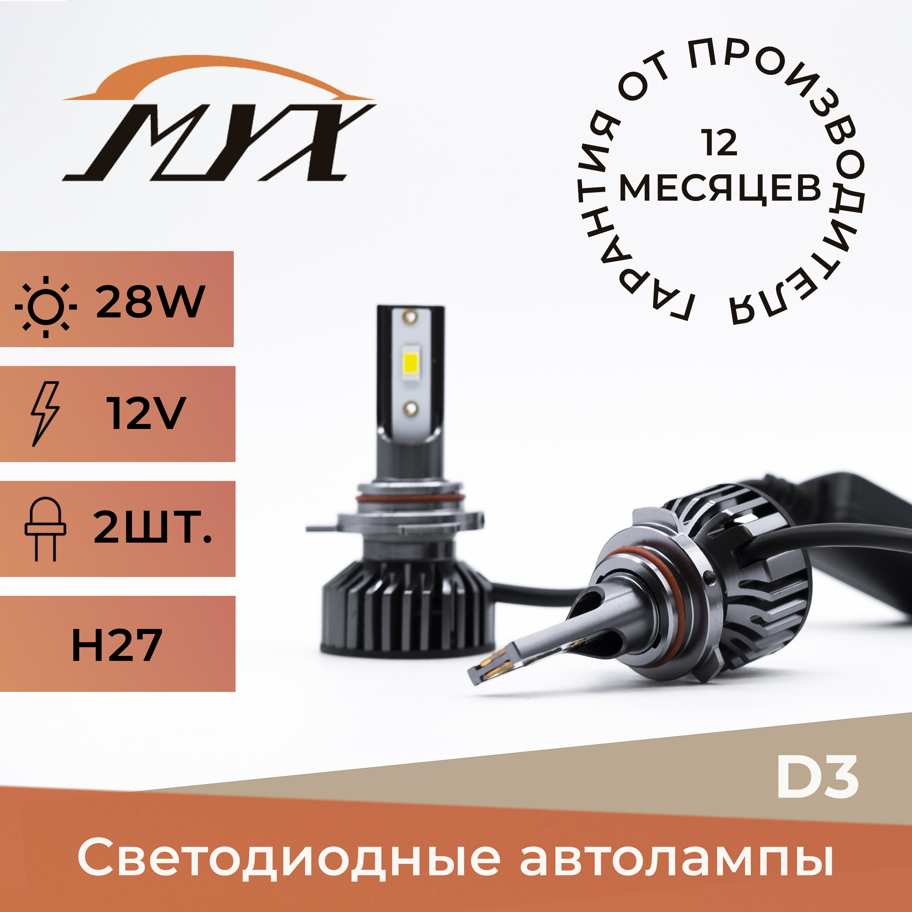 Автолампы Автолампы светодиодные MYX Light D3, напряжение 12V, мощность 28W, чип CSP 3570, температура света 6000K, комплект 2 шт., цоколь H27