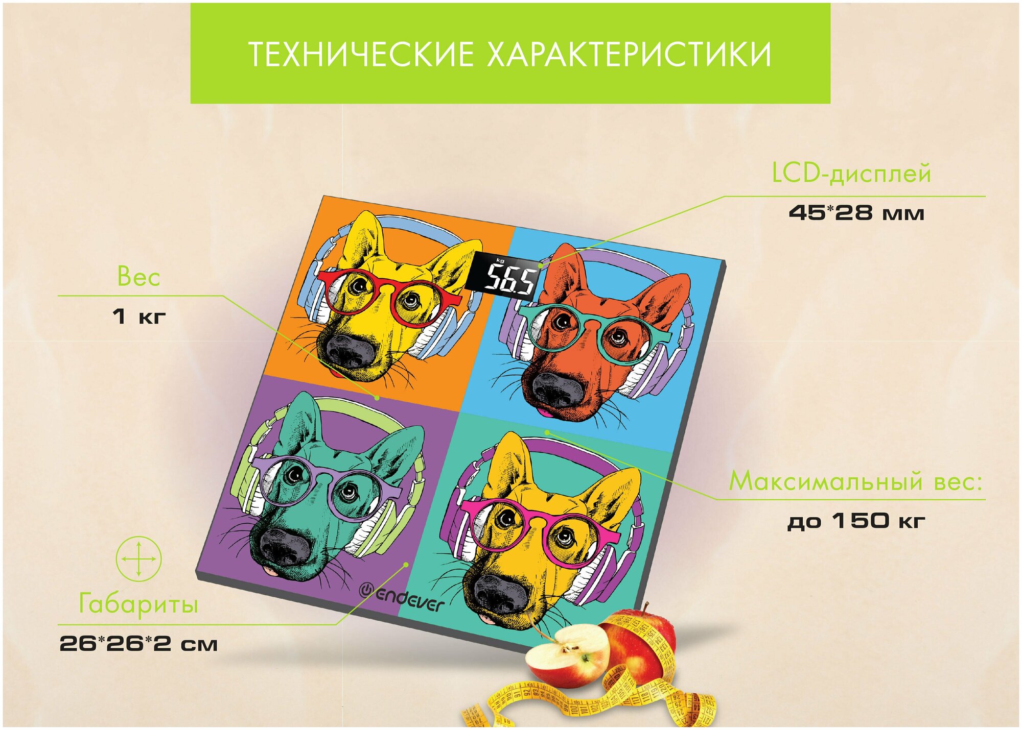 Весы Весы напольные электронные Endever Aurora-566 / рисунок Собака в Очках / закаленное стекло / до 150 кг