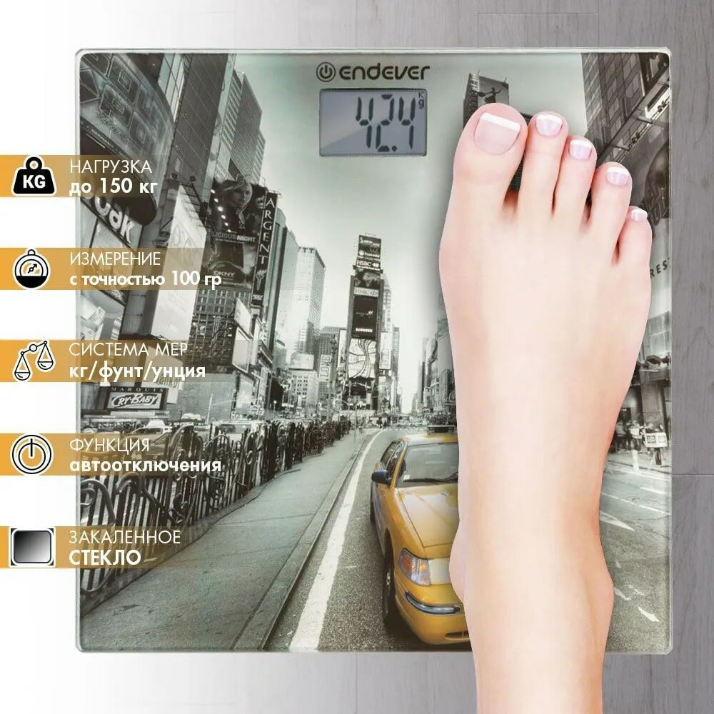 Лучшие цены. Электронные напольные весы Endever Aurora-557, рисунок Такси, материал закаленное стекло и металл, максимальный вес 150 кг, включение одним нажатием, LCD дисплей 45x28, вес 1кг. Магазины в вашем городе.