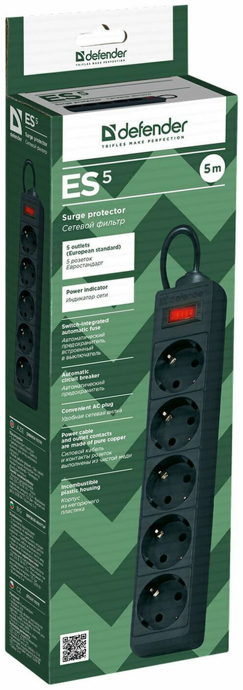 Сетевые фильтры и удлинители Сетевой фильтр Defender ES 5.0m (5роз.) black 99486