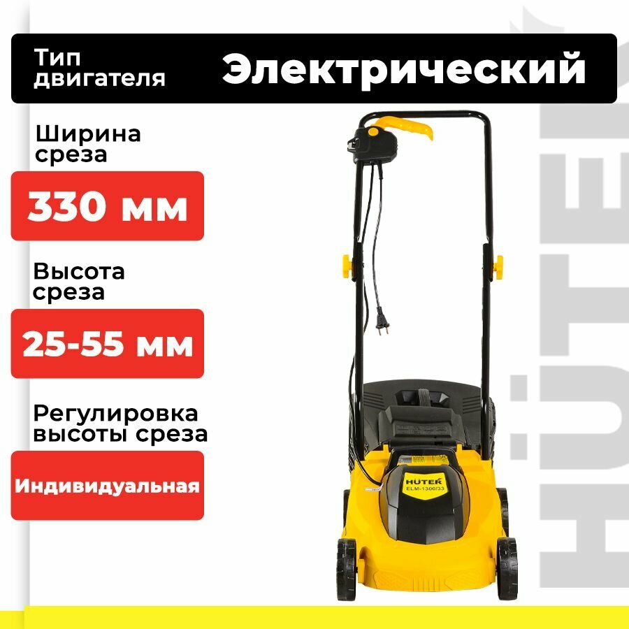 Газонокосилка электрическая Huter ELM-1300/33, 1300Вт, ширина скоса 33см, пластиковый травосборник на 30л 10 857 ₽ Подробнее