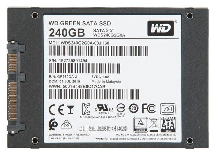 Western Digital SSD GREEN 240Gb SATA-III 2,5”/7мм WDS240G3G0A (аналог WDS240G2G0A), 1 year