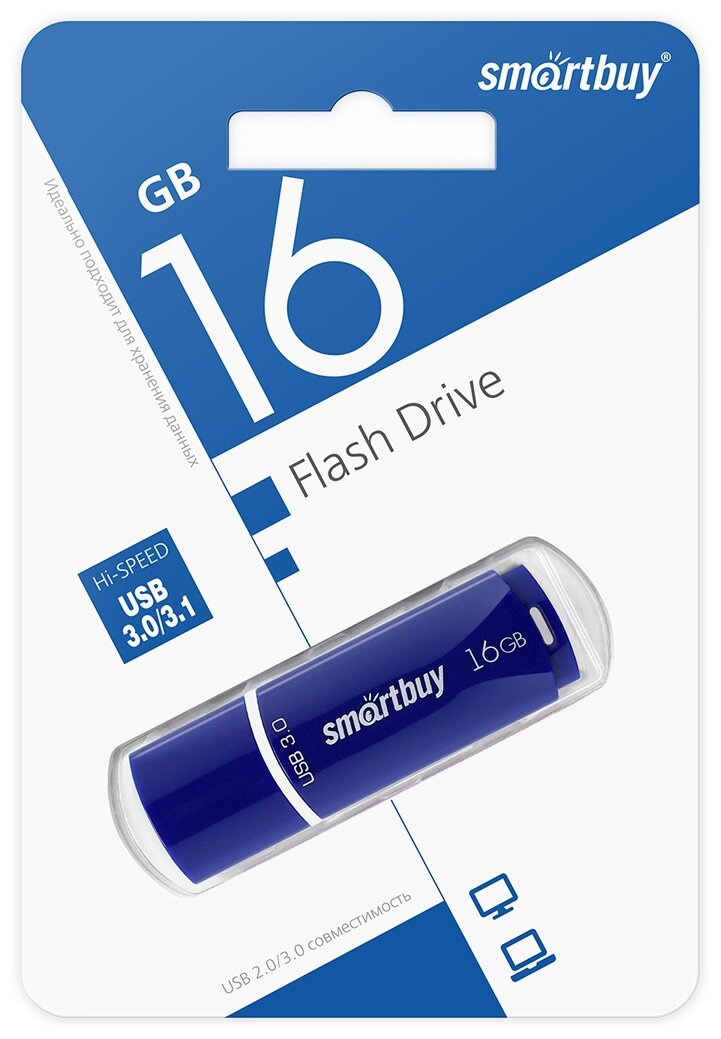 Лучшие цены. SmartBuy Crown ( SB16GBCRW-Bl) USB3.0 Flash Drive 16Gb (RTL) Корпус Пластиковый Объем Flash-накопителя 16 Гб Цвета, использованные в оформлении Синий Размеры (ширина x высота x глубина) 55 x 18 x 9 мм Вес 8 грамм Параметры производительности Скорость чтения до 75 Мб/сек Скорость записи до 10 Мб/сек Интерфейс, разъемы и выходы Интерфейс USB 3.1 Gen1 (=USB 3.0, совместимо с USB 2.0). Магазины в вашем городе.