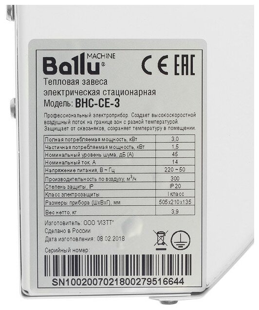 Лучшие цены. Электрическая тепловая завеса Ballu BHC-CE-3 – компактная завеса мощностью 3 кВт и производительностью до 300 м3/ч с оптимальным набором функций. Ballu BHC-CE-3 – применяется для защиты дверей и окон выдачи шириной до 50 см. Завеса крепится горизонтально над проемом при помощи двух винтов и подключается к стандартной розетке 16А 220В, кабель питания входит в комплект завесы. Завеса работает в двух режимах тепловой мощности – "половина мощности" и "полная мощность". Магазины в вашем городе.