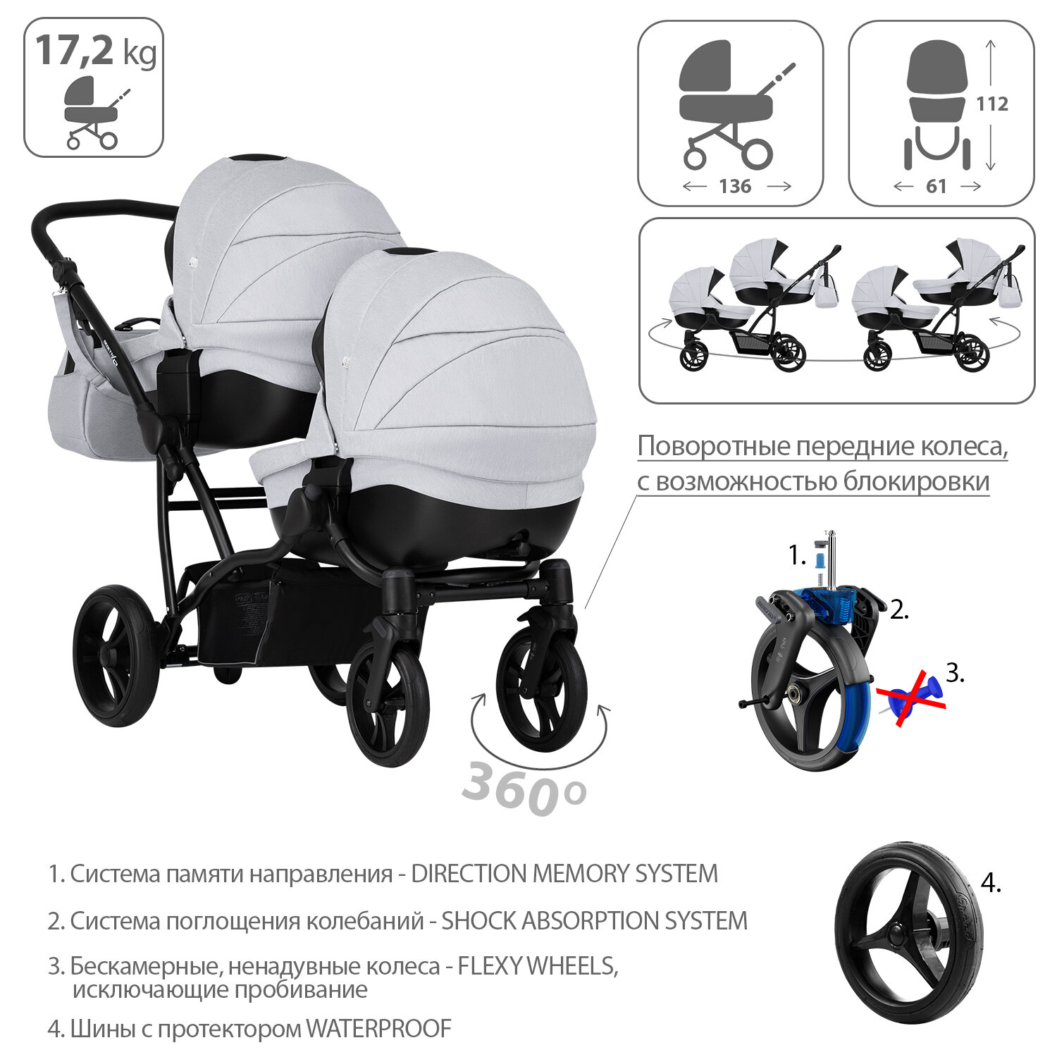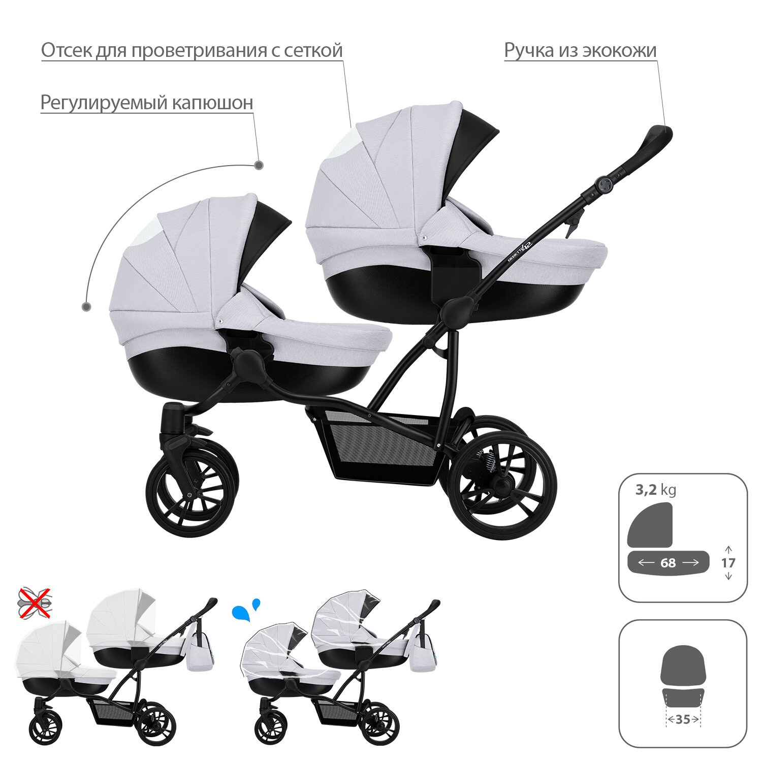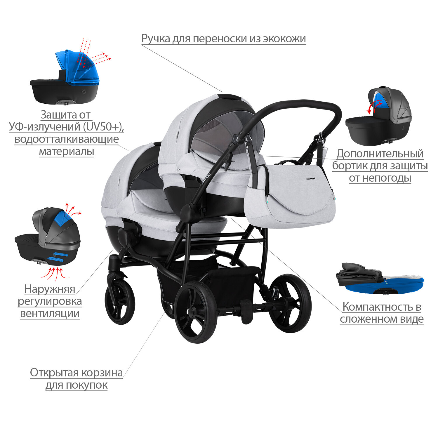 | Комплектация | прогулочный блок (2 шт) / люлька(2 шт) / накидка для ног(2 шт) / дождевик(2 шт) / москитная сетка(2 шт) / сумка / рюкзак для вещей / отделение для покупок |