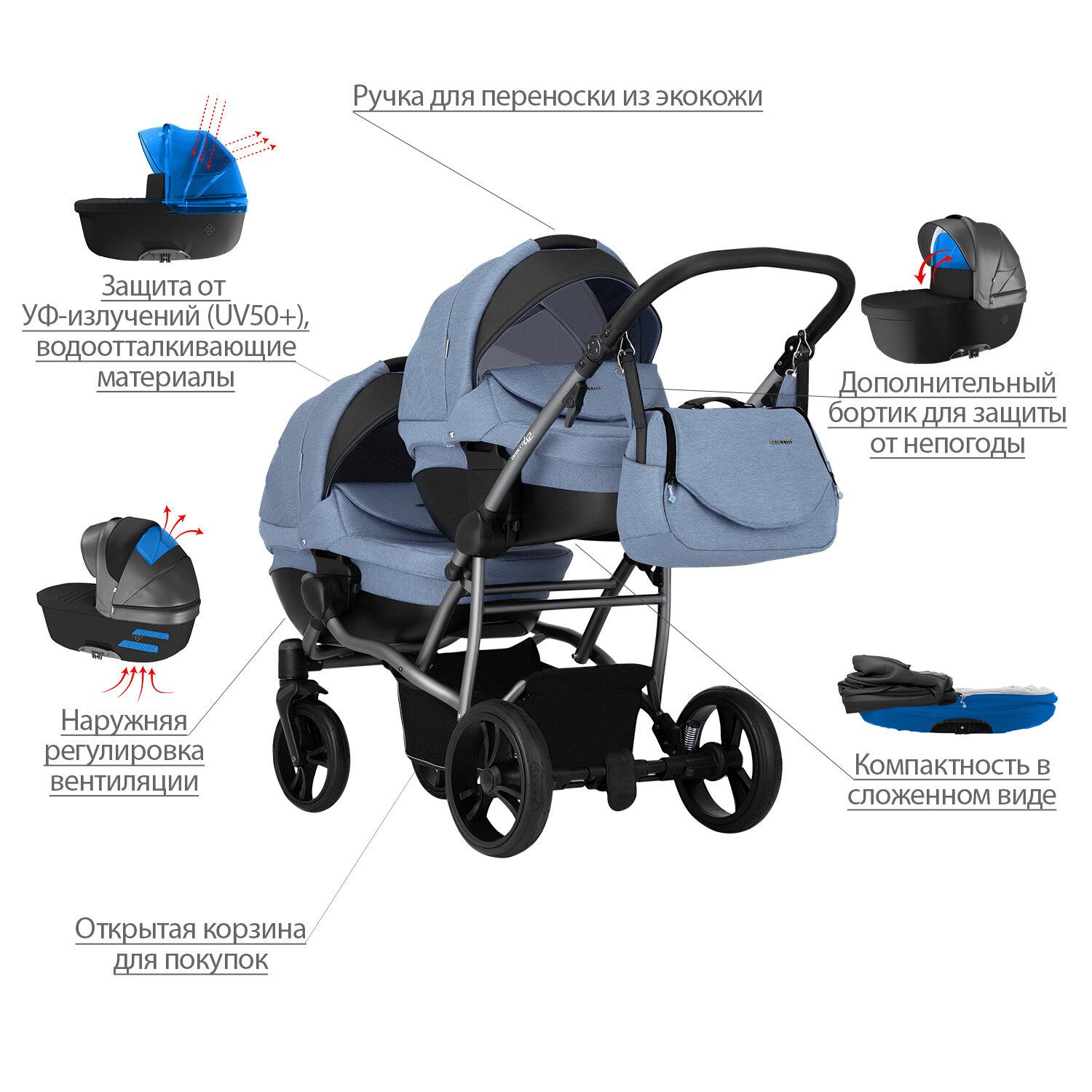| Комплектация | прогулочный блок (2 шт) / люлька(2 шт) / накидка для ног(2 шт) / дождевик(2 шт) / москитная сетка(2 шт) / сумка / рюкзак для вещей / отделение для покупок |