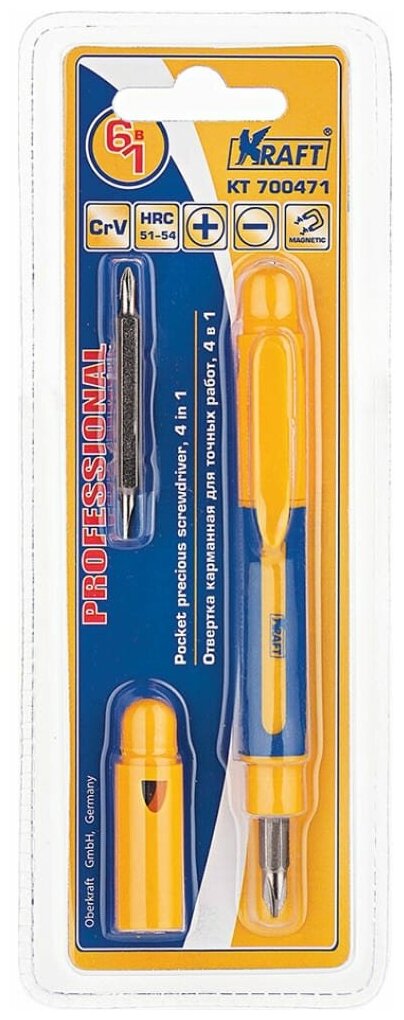 Лучшие цены. Карманная отвертка для точных работ 4 в 1 KRAFT KT 700471 для точной механики используется в мелкомасштабных работах для завинчивания и отвинчивания креплений с резьбовым соединением. Карманную отвертку ТМ Kraft удобно носить с собой, она не займет много места. Инструменты выполнены из высококачественной хромованадиевой стали. Отвертка оснащена намагниченным наконечником. Твердость по Роквеллу 51-54 HRc. Магазины в вашем городе.