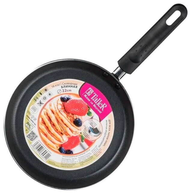 Лучшие цены. Название Сковорода блинная Taller TR 4167 22 см. Категория Сковороды и сотейники. Тип сковорода блинная. Материал алюминий. Антипригарное покрытие есть. Совместимость с индукционными плитами есть. Диаметр верха 22 см. Толщина дна 3 мм. Особенности мытье в посудомоечной машине, ненагревающаяся ручка. Дополнительная информация материал ручки: бакелит; марка антипригарного покрытия Whitford Xylan Plus. Магазины в вашем городе.