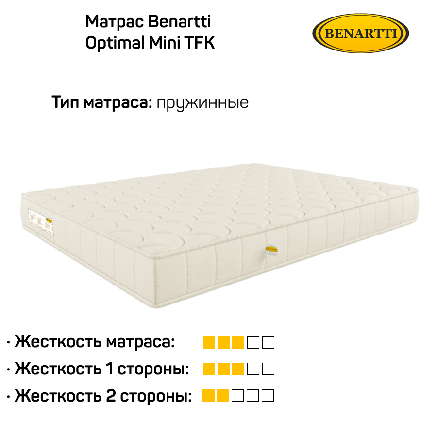 Лучшие цены. Матрас Benartti Optimal Mini TFK. Матрас Optimal Mini TFK с разными сторонами жесткости, общая высота матраса 18 см. Когда говорят "спать, как на облаке" - это про этот матрас. Максимально допустимая нагрузка на одно спальное место до 110 кг. Основой матраса является независимый пружинный блок TFK (512 пружин на одно спальное место). Каждая пружина находится в отдельном тканевом кармашке, что позволяет правильно распределять нагрузку тела. Магазины в вашем городе.