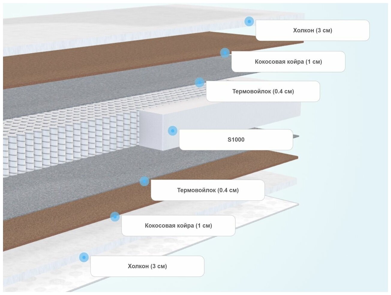 Лучшие цены. Матрас Comfort Line Hollo Hard S1000 Состав матраса: Жаккардовый чехол (200 гр. холлкона) Холлкон 3см Кокосовая койра 1см Войлок Независимый блок S1000 (1000 пруж./1 сп. место) Войлок Кокосовая койра 1см Холлкон 3см Жаккардовый чехол (200 гр. холлкона) Особенность работы пружин S1000 Модель практичная и недорогая, собирается на пружинном блоке современного типа - S1000. Все пружины в нем составлены в индивидуальные чехлы и не взаимодействуют друг с другом. Магазины в вашем городе.