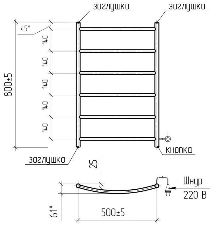 Электрический полотенцесушитель ТЕРА Ребро 500х800 с греющим кабелем, 6 перекладин ПСН-10-03
