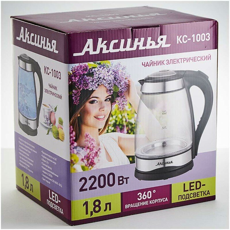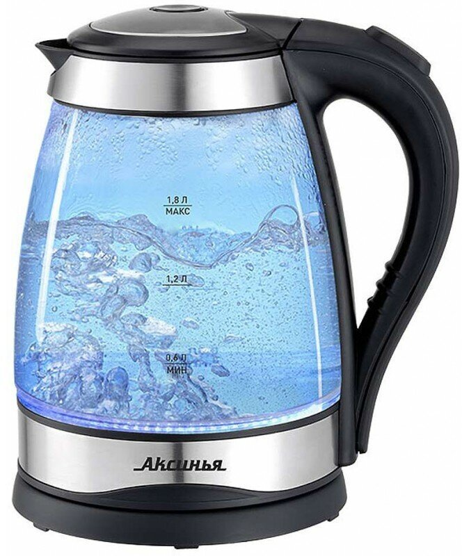 Электрочайник аксинья КС-1003, корпус из жаропр. стекла, черный: 2200Вт, объем 1,8 литра