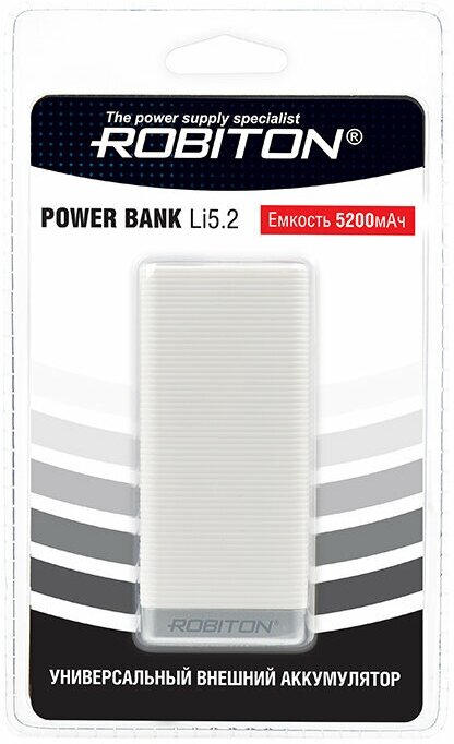 Лучшие цены. Power Bank Robiton Li5.2-W 5200мАч белый (внешний аккумулятор) 1штROBITON POWER BANK Li5.2– это компактный внешний аккумулятор с интеллектуальным контролем заряда. Совместим с большинством современных мобильных устройств: мобильными телефонами и смартфонами, планшетными компьютерами и другими устройствами.Внешний аккумулятор ROBITON POWER BANK Li5.2 заряжается от USB порта компьютера, ноутбука или от зарядных устройств с USB разъемом. Магазины в вашем городе.