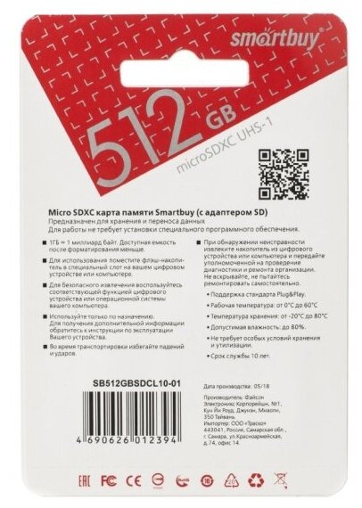 Карта памяти Smartbuy microSDXC 512GB Class 10 UHS-1 + SD адаптер