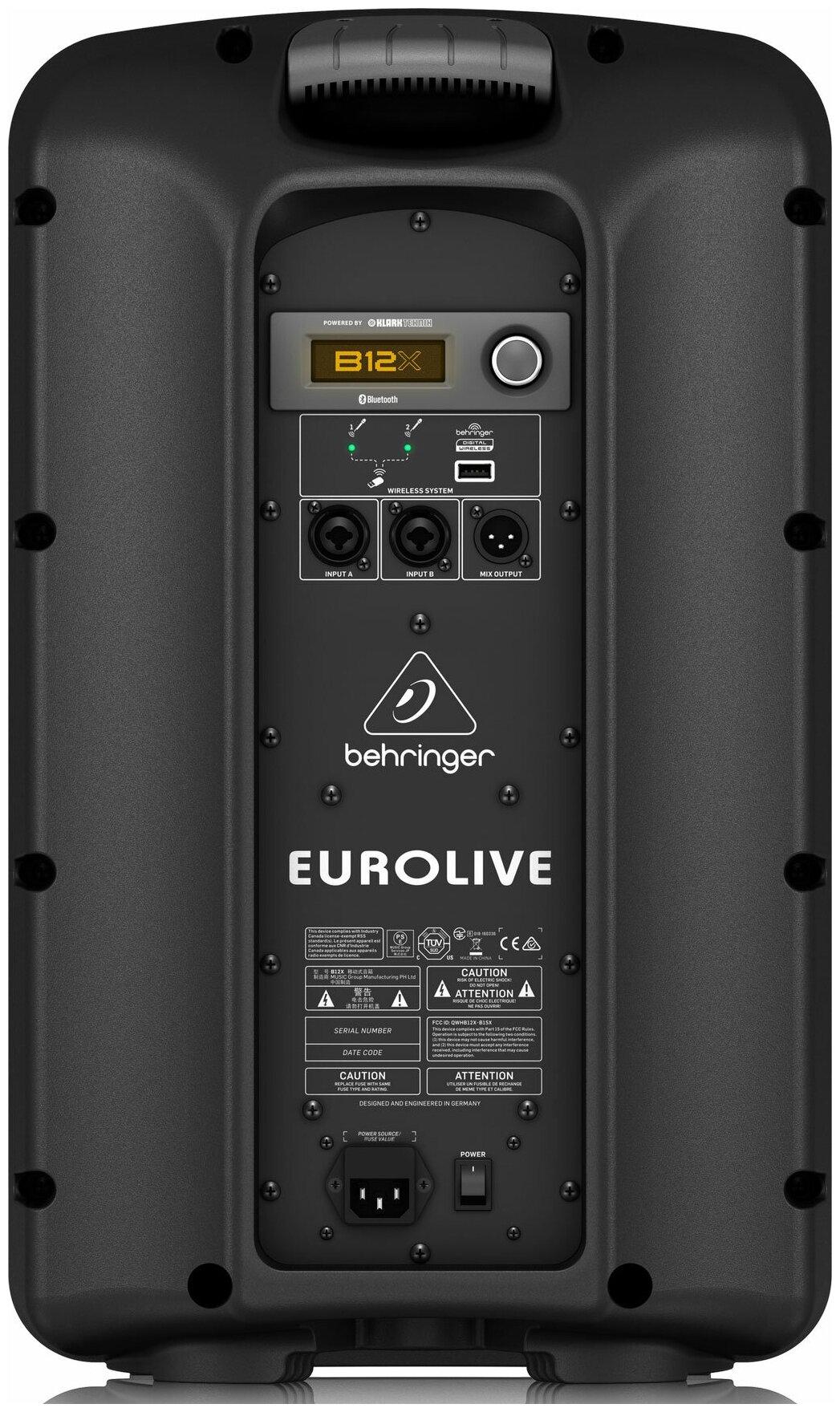 Behringer B12X активная акустическая система, 12"+1"фенольный, 1000Вт (700Вт+300Вт) пик. Klark Teknik, Bluetooth, вход Behringer Wireless, пластик, 14.5кг, чёрный