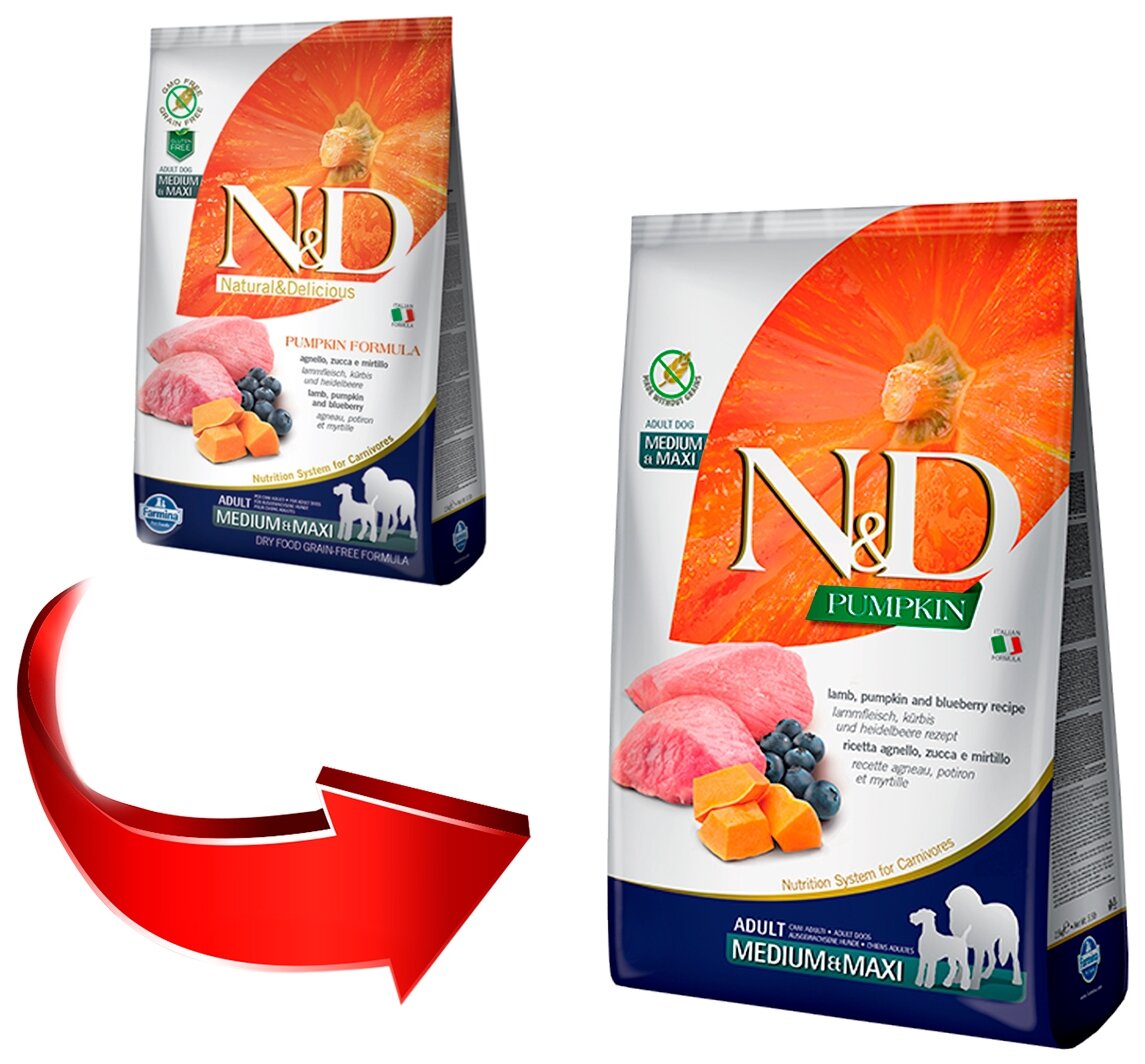 Корм для собак FARMINA DOG N&D GRAIN FREE PUMPKIN ADULT MEDIUM & MAXI LAMB & BLUEBERRY беззерновой для взрослых собак средних и крупных пород с ягненком, черникой и тыквой (12 кг)