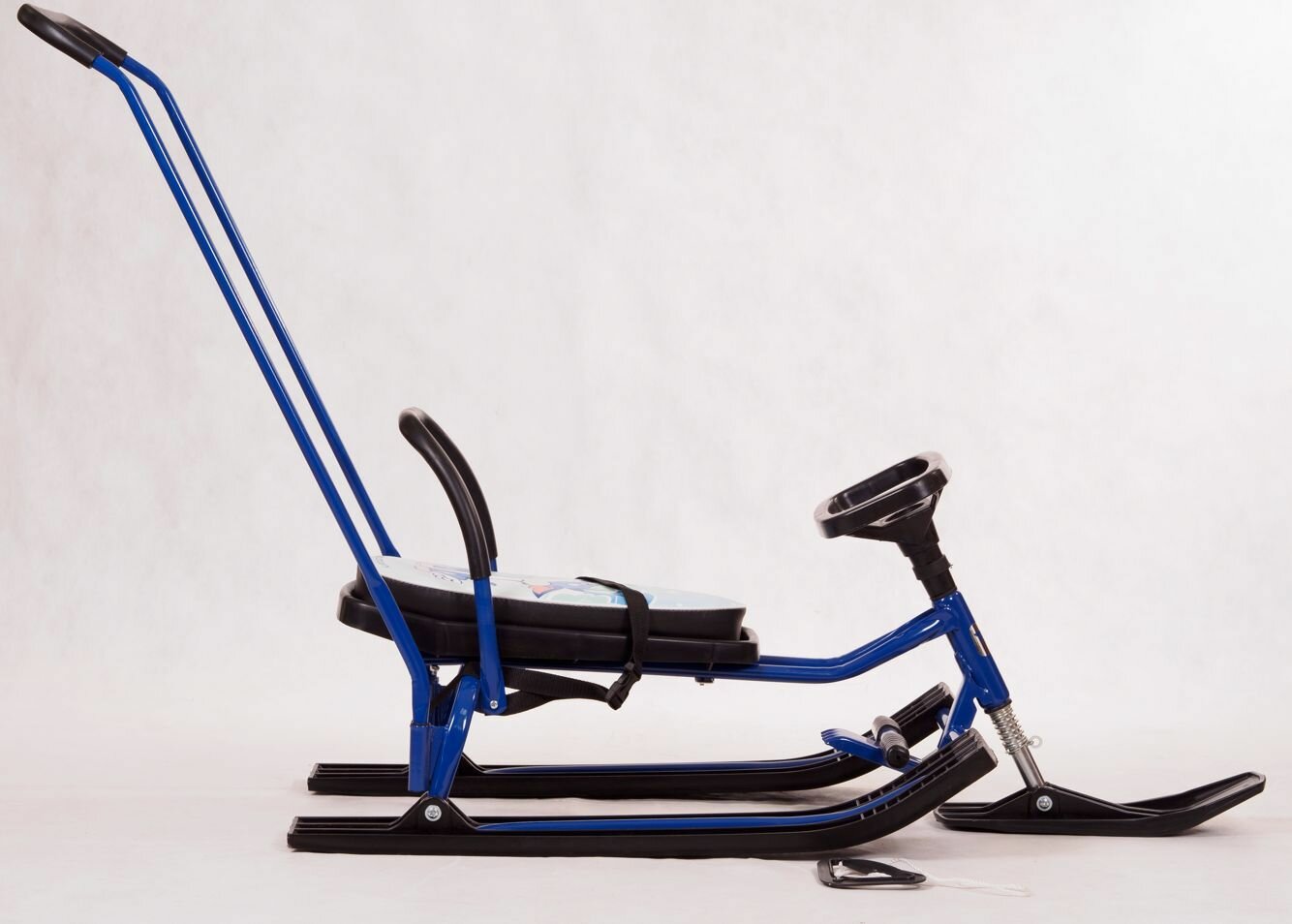 | Оснащение | спинкарулевое управлениебуксирный шнурручка-толкательтормозсистема амортизацииремень безопасности |