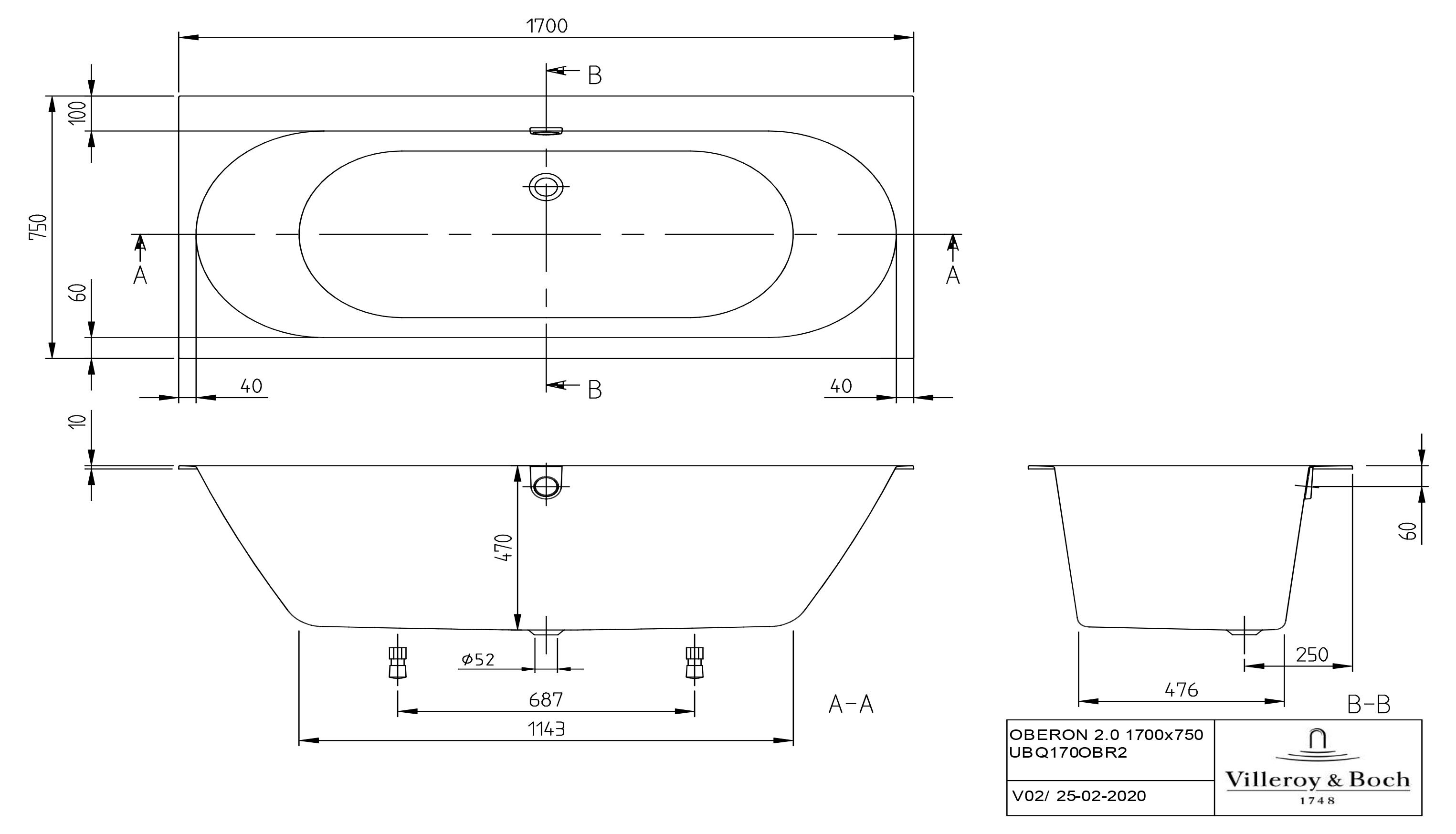 Ванна Villeroy & Boch OBERON 170х75см белый с ножками и сверлом для перелива 170OBE2V-01