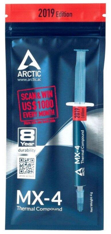 Термопаста ARCTIC MX-4 ACTCP00002B 4г, шприц, теплопроводность 8.5 Вт/мК, вязкость 870 пуаз, плотность 2.5 г/см³