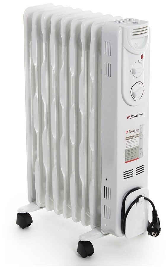 Лучшие цены. Белый масляный радиатор BINATONE OR-090 с девятью секциями. Предназначен для напольной установки, для удобства в перемещении имеет колесики в основании. На основной части корпуса расположен световой индикатор, оповещающий о работе радиатора, регулятор мощности и температурный регулятор. Магазины в вашем городе.