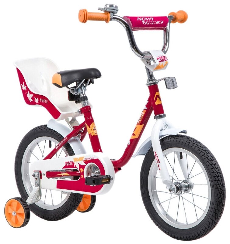 Велосипед NOVATRACK 14" MAPLE, красный, полная защита цепи, тормоз нож, крылья цвет, сидение для кук