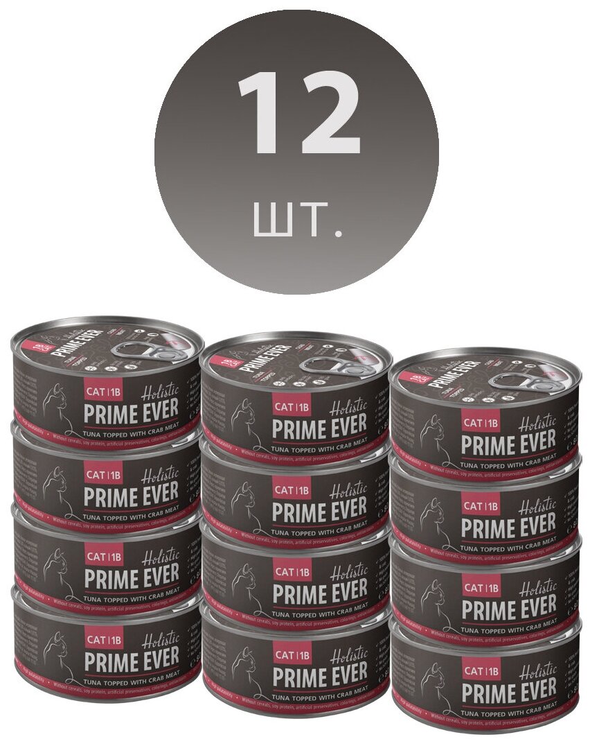 Влажный корм для кошек, тунец с крабом в желе, холистик, Prime Ever, упаковка 12 шт х 80 г