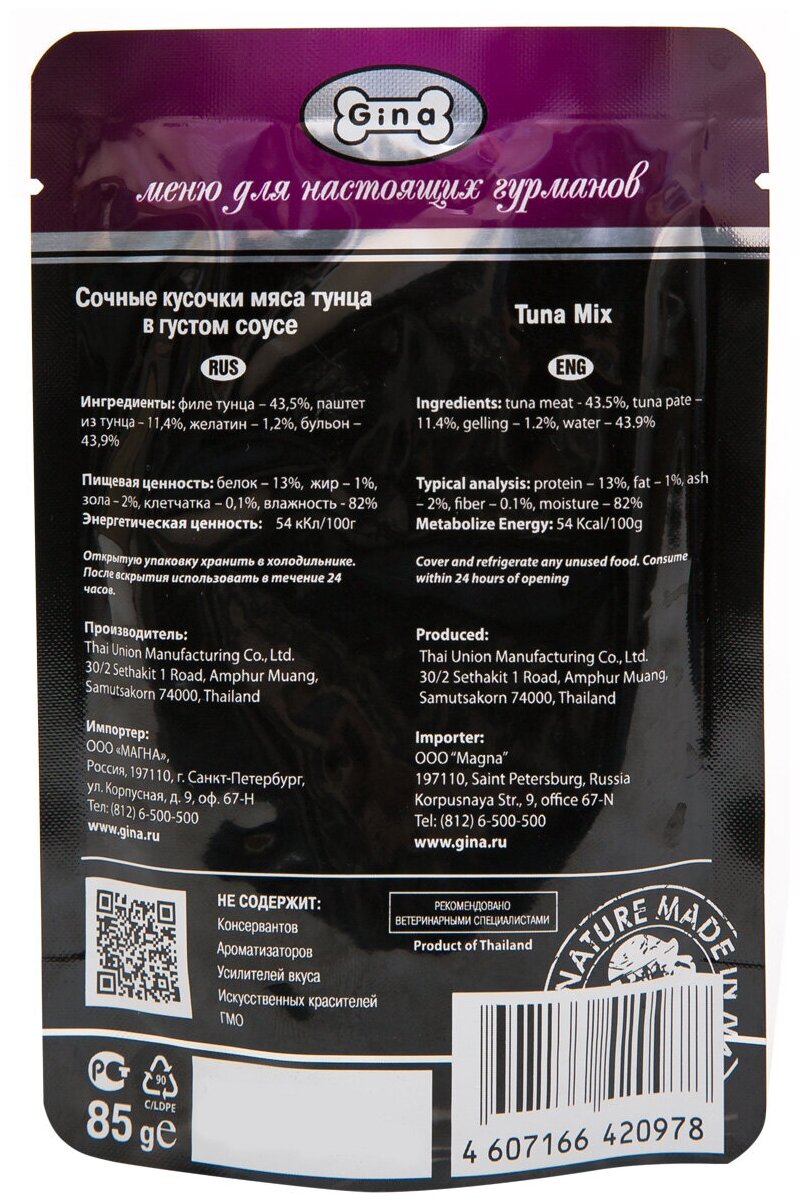 GINA TUNA MIX пауч для кошек сочные кусочки мяса тунца в густом соусе 85г