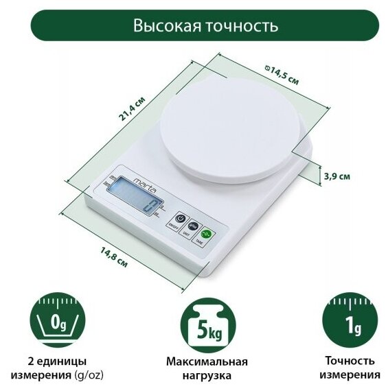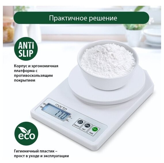Лучшие цены. С электронными кухонными весами Marta MT-1637 вы сможете точно следовать рецепту. Прибор выдерживает нагрузку до 5 кг, точность измерения – 1 г, так что он пригодится вам и в повседневном приготовлении пищи, и в период сезонных заготовок. простое И удобное управление Полезна функция «Тара». Поставьте ёмкость на платформу, нажмите на кнопку Tare и обнулите показания, а потом положите продукты – так вы узнаете их «чистый» вес. Решили поэкспериментировать и приготовить блюдо по рецепту с иностранного сайта. Магазины в вашем городе.