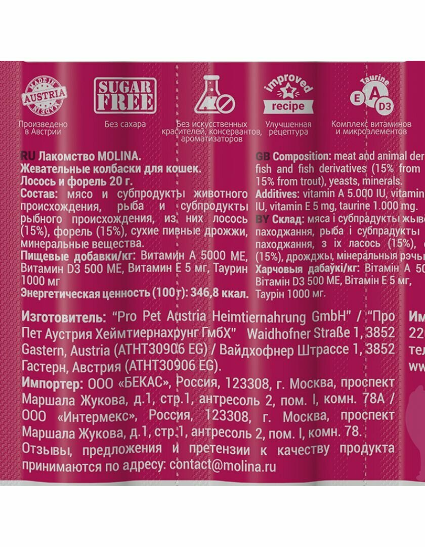 Лакомство MOLINA для кошек колбаски с лососем и форелью (20 гр х 2 шт)
