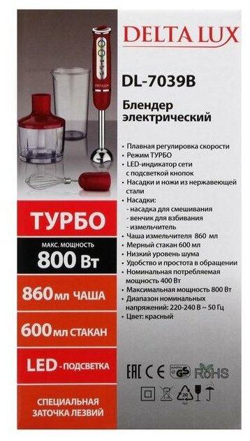 Блендер погружной Delta LUX DL-7039B 800Вт красный .