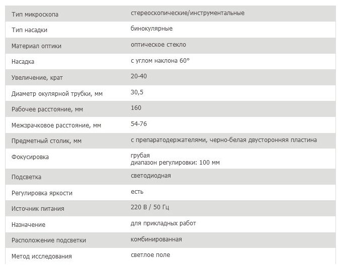 Лучшие цены. Современный инструментальный микроскоп с очень большим рабочим расстоянием 160 мм и переменным увеличением в диапазоне от 20 до 40 крат. Бинокулярная насадка удобно наклонена на 60° относительно вертикали. Есть возможность грубой фокусировки и регулировки межзрачкового расстояния. В комплекте также идет предметный столик с темным и светлым полем, объективы 2x и 4x, силиконовый чехол. Магазины в вашем городе.