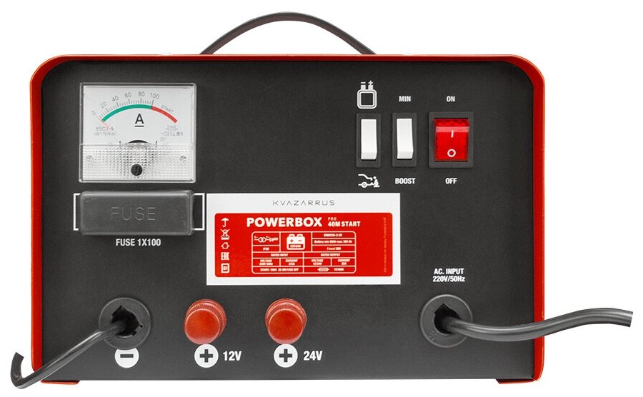Лучшие цены. Пуско-зарядное устройство KVAZARRUS PowerBox 40M START предназначено для зарядки свинцово-кислотных аккумуляторных батарей, используемых на дизельных и бензиновых двигателях, мотоциклах, моторных лодках и т.д. Плавкий предохранитель 100A - 1шт, инструкция, гарантийный талон. Оснащено переключателем для выбора нормальной и ускоренной зарядки (BOOST) и функцией «Запуск». Устройство снабжено тепловой защитой. Магазины в вашем городе.