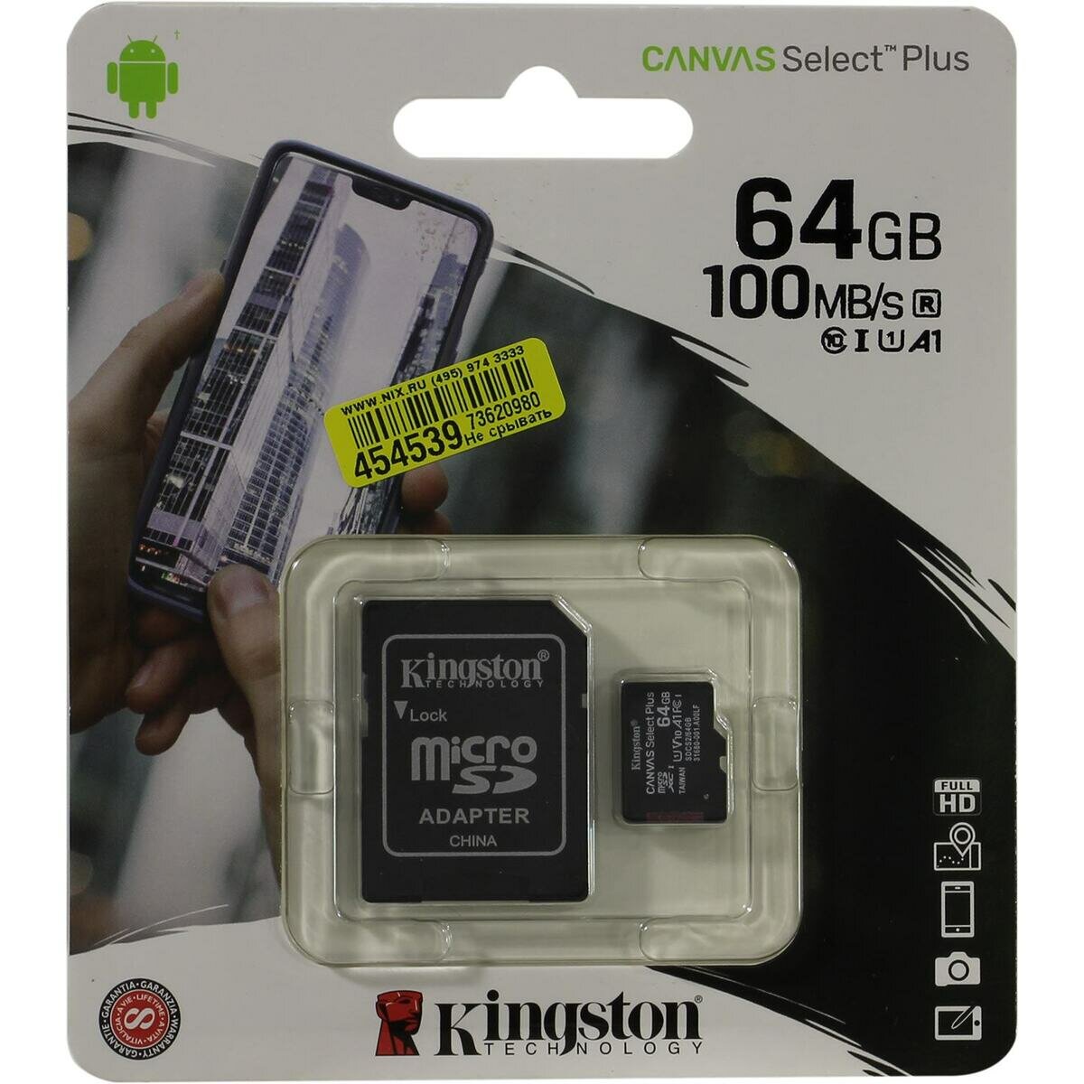Карта памяти microSDXC 64 Гб, 100Mb/с, Kingston Canvas Select Plus, UNS-I, Class 10 (SDCS2/64GBSP)