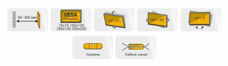 | Крепление VESA | 200x200 мм / 200х300 мм / 200x400 мм / 300x200 мм / 300x300 мм / 300x400 мм / 400x200 мм / 400x300 мм / 400x400 мм / 500x400 мм / 600x400 мм / 600х600 мм / 700x400 мм / 800x400 мм |