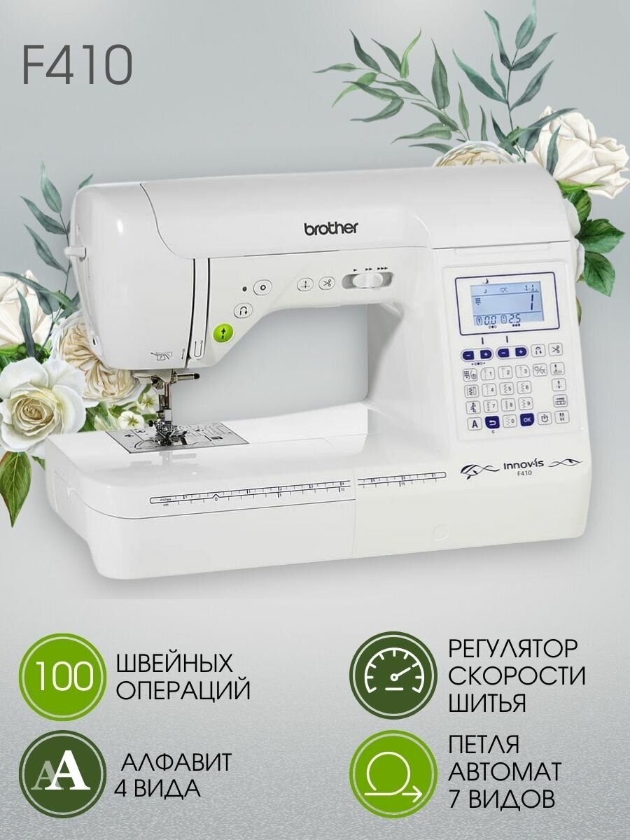 Лучшие цены. Швейная машина Brother Innov-is F410 представляет современный ряд компьютеризованных машин с фантастическими возможностями для творчества. Вы оцените впечатляющее количество швейных операций (в том числе автоматических), 4 встроенных шрифта и новую систему привода транспортёра. Большой контрастный экран покажет все настройки для каждого типа операций. Новая усовершенствованная система подачи ткани обеспечивает отличное качество строчки. Нитевдеватель позволяет быстро заправить иглу, не напрягая глаза. Магазины в вашем городе.